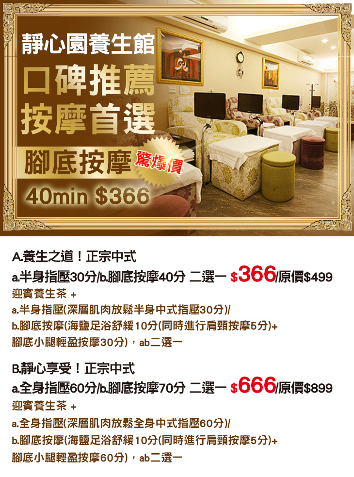 A.養生之道!正宗中式 a.半身指壓30分/b.腳底按摩40分 二選一