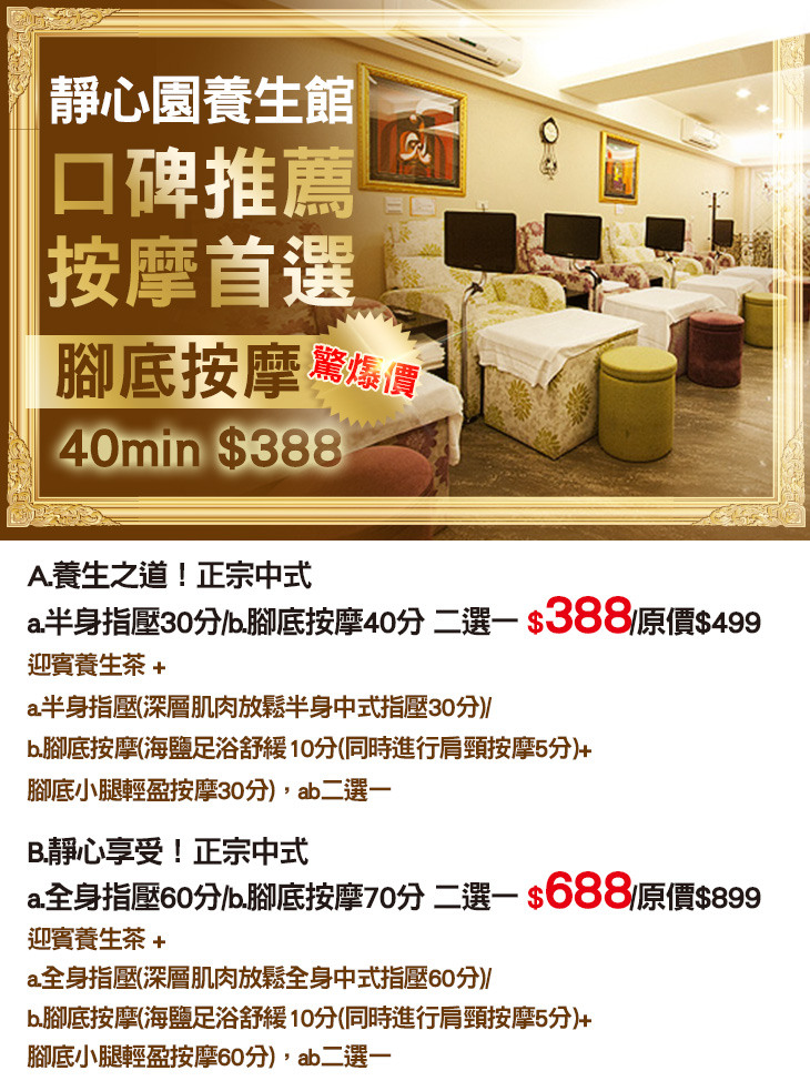 A.養生之道!正宗中式 a.半身指壓30分/b.腳底按摩40分 二選一