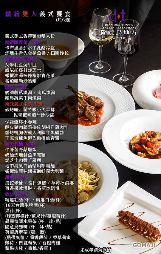 【隨意鳥地方】闊別多時再度與GOMAJI攜手合作,麻吉絕對要把握難得機會!這回頂級美食團隊送上繽紛雙人義式饗宴,一共有8項單品(雙人)只要1588元,主廚絞盡腦汁下設計的五星級菜單,每一道皆是苦心完成的作品,不只滿足味蕾靈魂感動,更讓視覺感受前所未有的刺激!