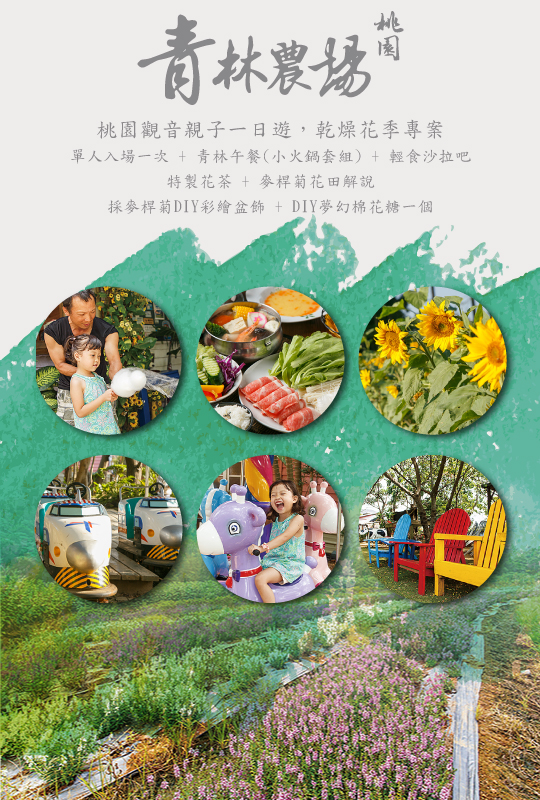 只要399元,即可享有【桃園-青林農場】桃園觀音親子一日遊,乾燥花季專案〈含單人入場一次 + 青林午餐(小火鍋套組) + 輕食沙拉吧 + 特調花茶 + 麥桿菊花田解說 + 採麥桿菊DIY彩繪盆飾 + DIY夢幻棉花糖一個〉