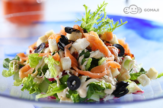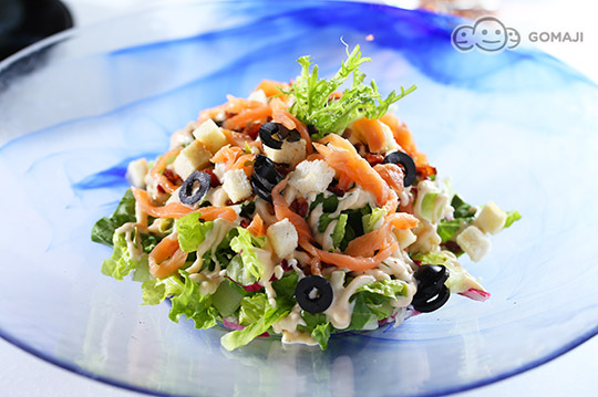 整株的蘿蔓生菜切塊,加上自製麵包丁,煙燻鮭魚片,培根丁與黑橄欖片。淋上和風式的自製凱薩醬汁,適合前菜食用。