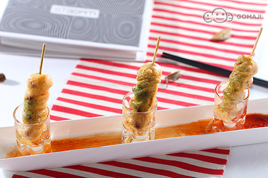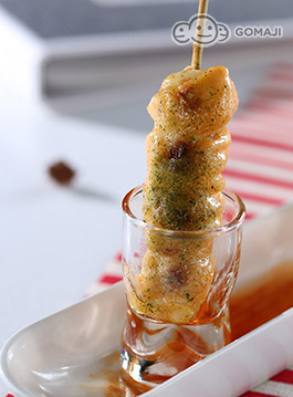 麻糬丸子烤上色後,加上割下醬-綿糖與醬油所熬煮的醬汁一起燒烤,還有特製的明太子醬及美乃滋,口味既獨特又美味,是道相當受歡迎的下酒菜,底部為可沾式辣醬,微辣的刺激口感更添風味。