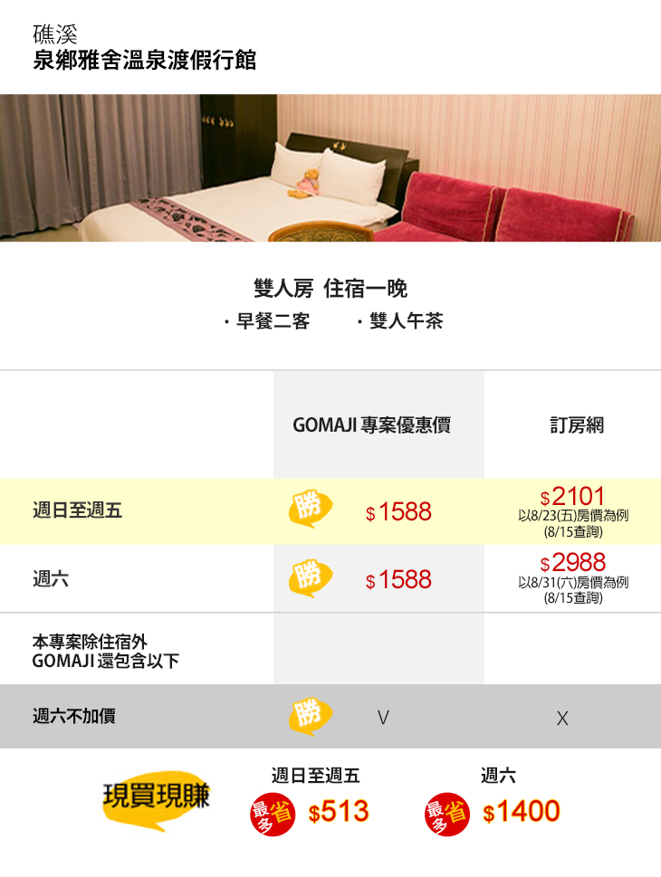 ★ 雙人一泊二食,週六不加價!