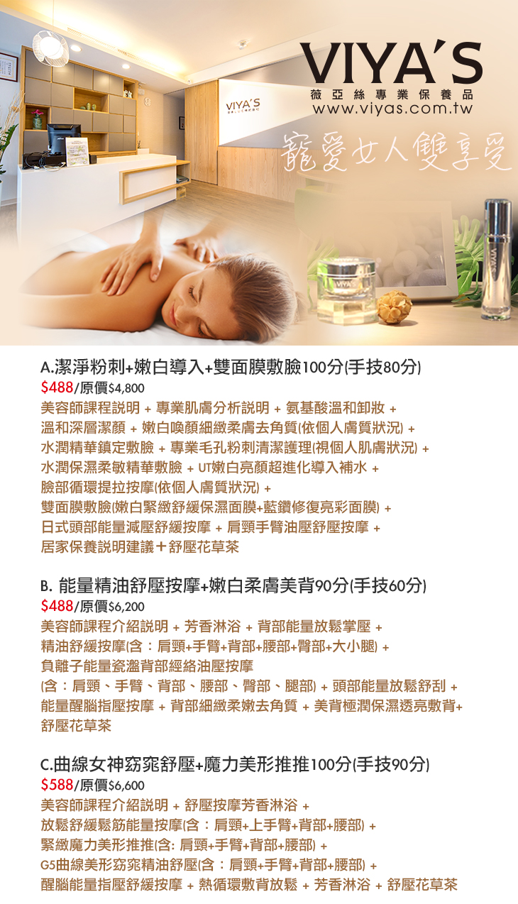 薇亞絲專業保養品由國外進口,針對亞洲女性肌膚而設計,高品質的頂尖專櫃品牌,才能給肌膚最完美無瑕的細緻呵護,現在就來【VIYA'S 薇亞絲】享受一次優質頂級的美容保養呵護,在私密的美容室中,得到身心靈的全方位滋潤吧!