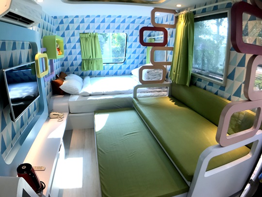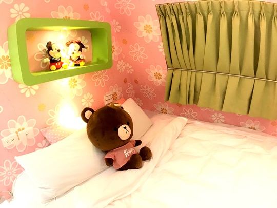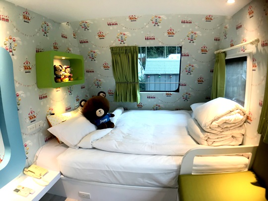 花園露營車裡擺設豪華,比外觀看起來還大得多,房間四周以木質色系為基調,高貴的壁燈點綴著浪漫優雅氣息,在夜裡拉開窗簾有月光會映照在純白的大床上,還有可愛小熊陪伴,真是羅曼蒂克到令人捨不得睡!