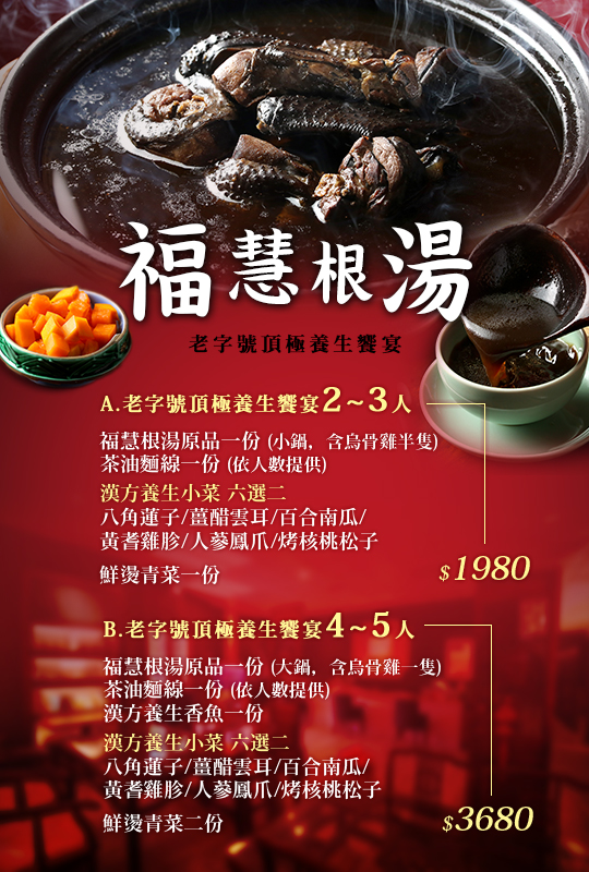 福慧根湯原品一份(大鍋,含烏骨雞一隻) + 茶油麵線一份(依人數提供) + 漢方養生香魚一份 + 漢方養生小菜:八角蓮子/薑醋雲耳/百合南瓜/黃耆雞胗/人蔘鳳爪/烤核桃松子 六選二 + 鮮燙青菜二份
