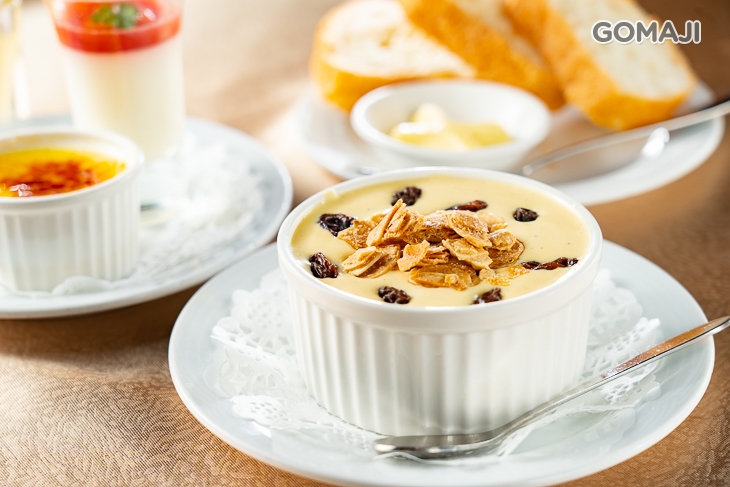 來自英國的麵包布丁,將鬆軟酥香的麵包融入輕甜不膩、綿密滑嫩的布丁之中,用湯匙勺起品嚐,吸飽了牛奶蛋液的麵包變得柔軟濕潤,甜而不膩的布丁香氣均勻纏繞著麵包體,每一次咀嚼,讓人幸福萬分的甜蜜滋味便一湧而出在齒唇間游移,在大快朵頤冷菜、熟食之後,來這樣一份簡單、甜美的麵包布丁最好不過了!