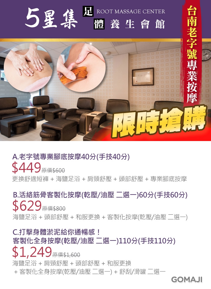 A.老字號專業腳底按摩40分(手技40分) / B.活絡筋骨客製化按摩(乾壓/油壓 二選一)60分(手技60分) / C.打擊身體淤泥給你通暢感!客製化全身按摩(乾壓/油壓 二選一)110分(手技110分)