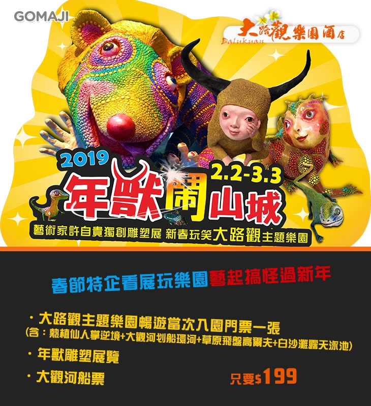 只要199元,即可享有【大路觀主題樂園】春節特企看展玩樂園藝起搞怪過新年〈含大路觀主題樂園暢遊當次入園門票一張(含:熱植仙人掌逆境+大觀河划船環河+草原飛盤高爾夫+白沙灘露天泳池) + 年獸雕塑展覽 + 大觀河船票〉