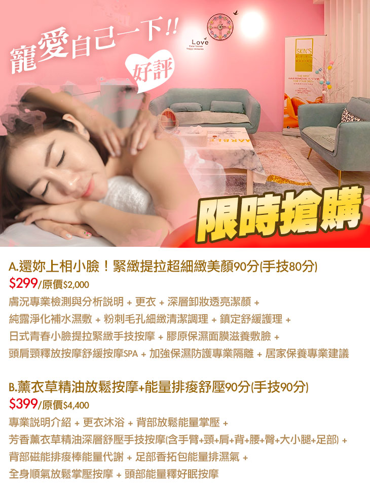 B.薰衣草精油放鬆按摩+能量排痠舒壓90分(手技90分)