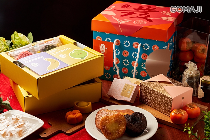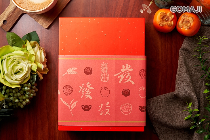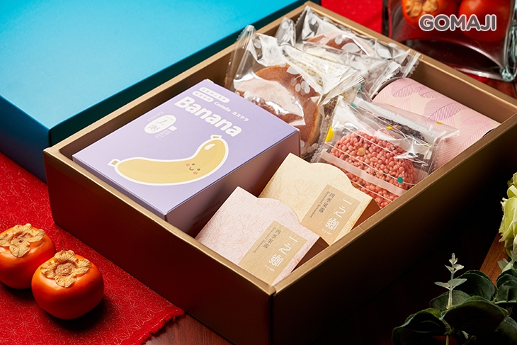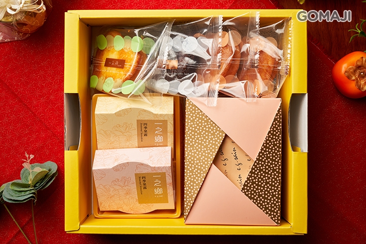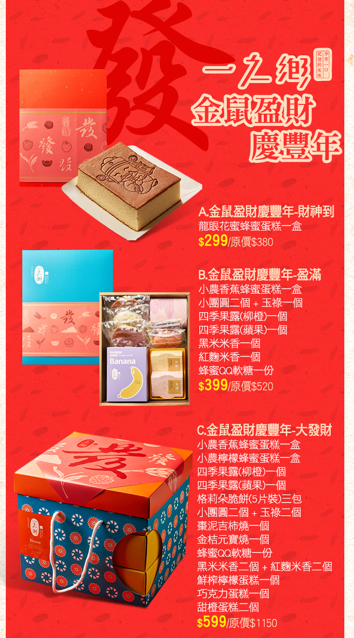 三層豪華的大發財禮盒,用果香豐盈的小農香蕉蜂蜜蛋糕、小農檸檬蜂蜜蛋糕,以及四季果露為頭,配上酥脆香甜的格莉朵脆餅、大富大貴超吉祥的小團圓及玉祿、棗泥吉柿燒、金桔元寶燒等精緻小品,令人大飽口福、福氣盡收!