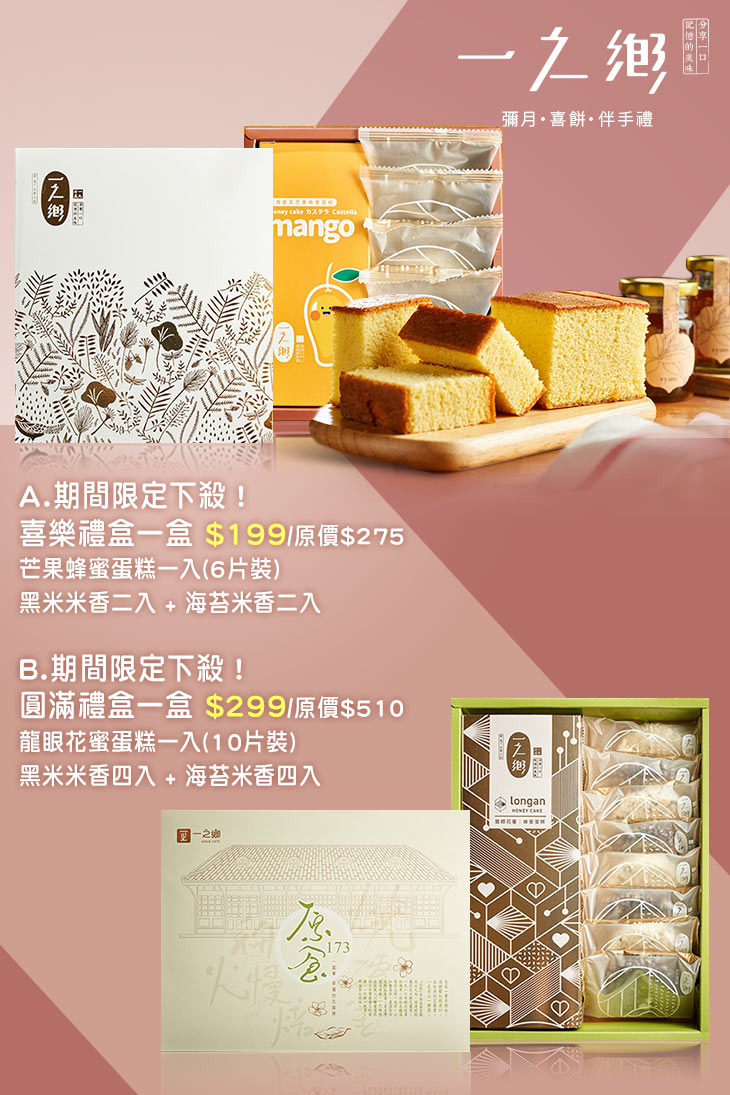 台灣起家,歷經四十餘年的【一之鄉】,四十餘年間一直堅持著「原食精神」,產品裡絕對不添加防腐劑,並精心挑選本土好食材用心製作,如【一之鄉】的招牌──蜂蜜蛋糕,便是採用頂級的龍眼花蜜、天然海藻糖以及每日新鮮直送的優質雞蛋,透過老師傅巧手,以費工費時的「細火烘焙製法」製作,自創立以來已熱賣超過四十萬條,成功征服許多人的味蕾!這雋永典藏的蜜香好味,絕對要入手品嚐!
