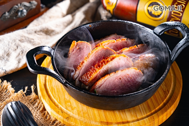 主廚嚴選上好的櫻桃鴨胸肉,透過精確的火侯香煎料理,讓鴨皮酥薄香脆、鴨肉則飽含肉汁,一端上桌,那透著嫩粉色澤的鴨胸肉,令人垂涎三尺,切下一塊垂涎欲滴的鴨肉入口品嚐,霎時間鴨肉豐盈的鮮甜氣息便在口中散開,酥香的外皮搭上細緻且鮮嫩多汁的肉質口感,實在令人欲罷不能,就連挑嘴的美食老饕,都愛不釋口!