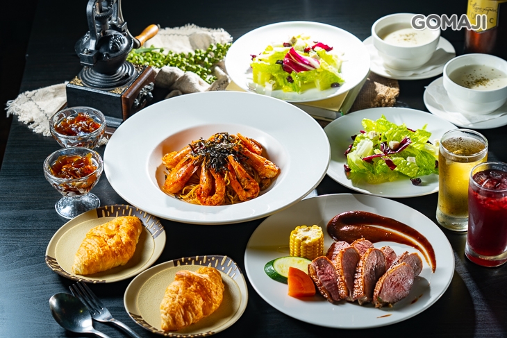 辣炒鮮蝦天使麵一份 + 香煎櫻桃鴨胸一份 + 麵包二個 + 季節湯品二份 + 季節沙拉二份 + 咖啡凍二份 + 季節飲品無限暢飲