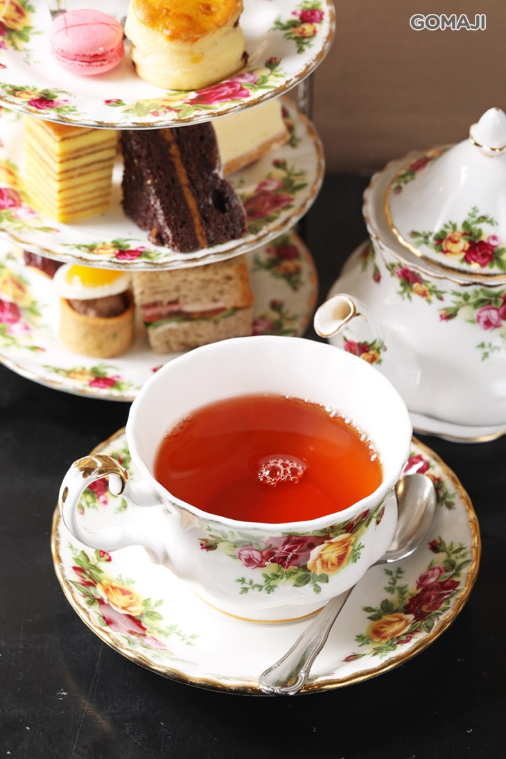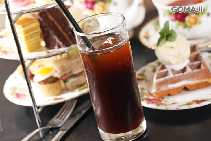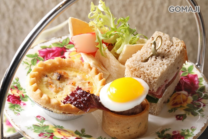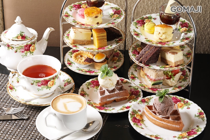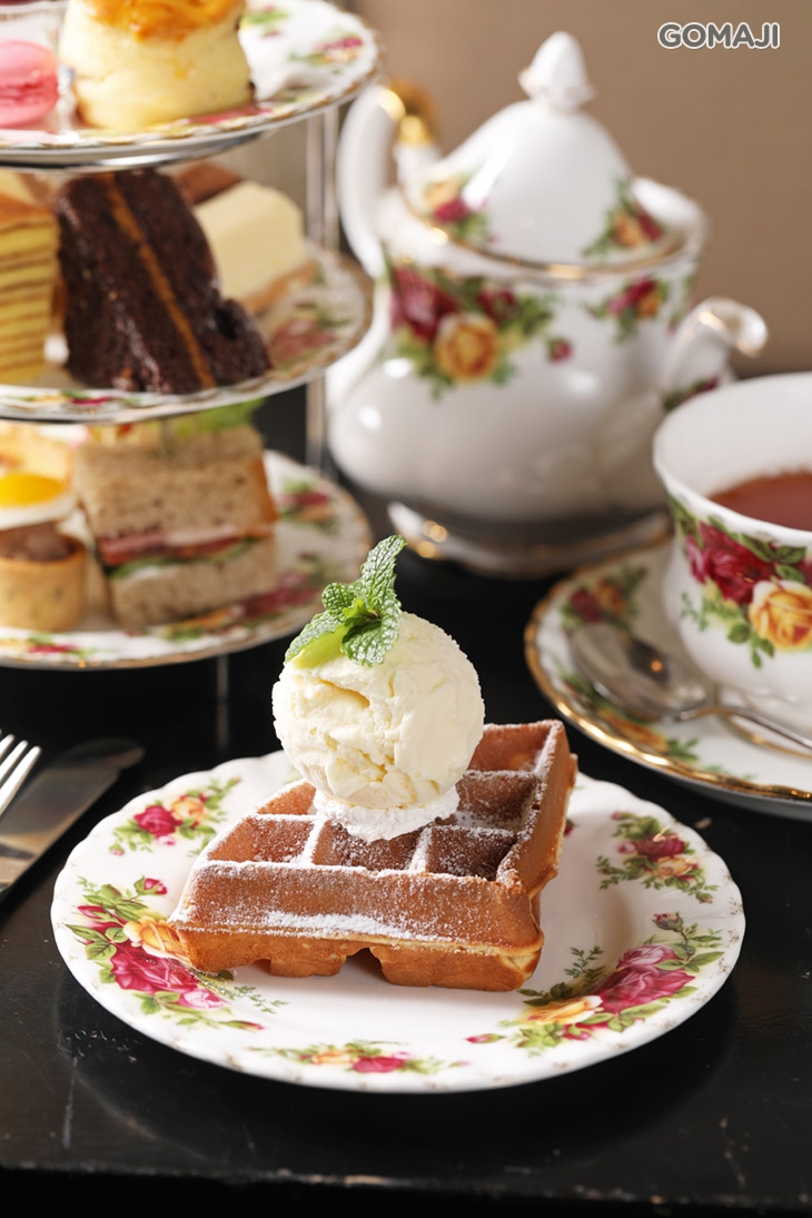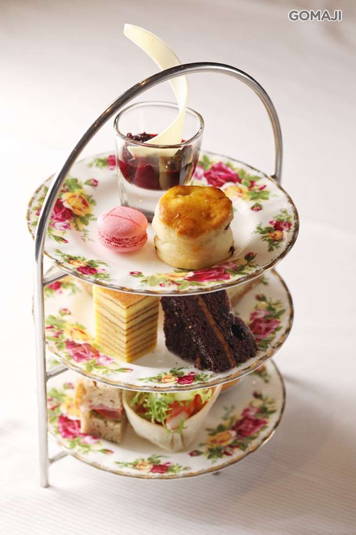 金色的三層架上放置著各式各樣的鹹甜點,味道豐富,富於變化;搭配咖啡或茶飲,講究的餐點與飲料配搭,重新把奢華定義於細節。偌大的紫色水晶燈下,寬大的沙發座椅,充滿自然光的空間,讓您輕鬆投入午後的慵懶,以最閒適的心情,與好友聚會聊天。