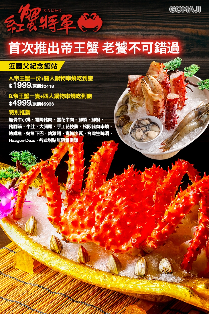 【紅蟹將軍】來啦!萬眾引頸企盼,嗷嗷待哺的海鮮朝聖者們,本檔優惠就是為各位麻吉們而來!霜降豬肉、雪花牛肉、鮮蝦、鮮蚵等等,讓你一口氣吃到所有美味!還有