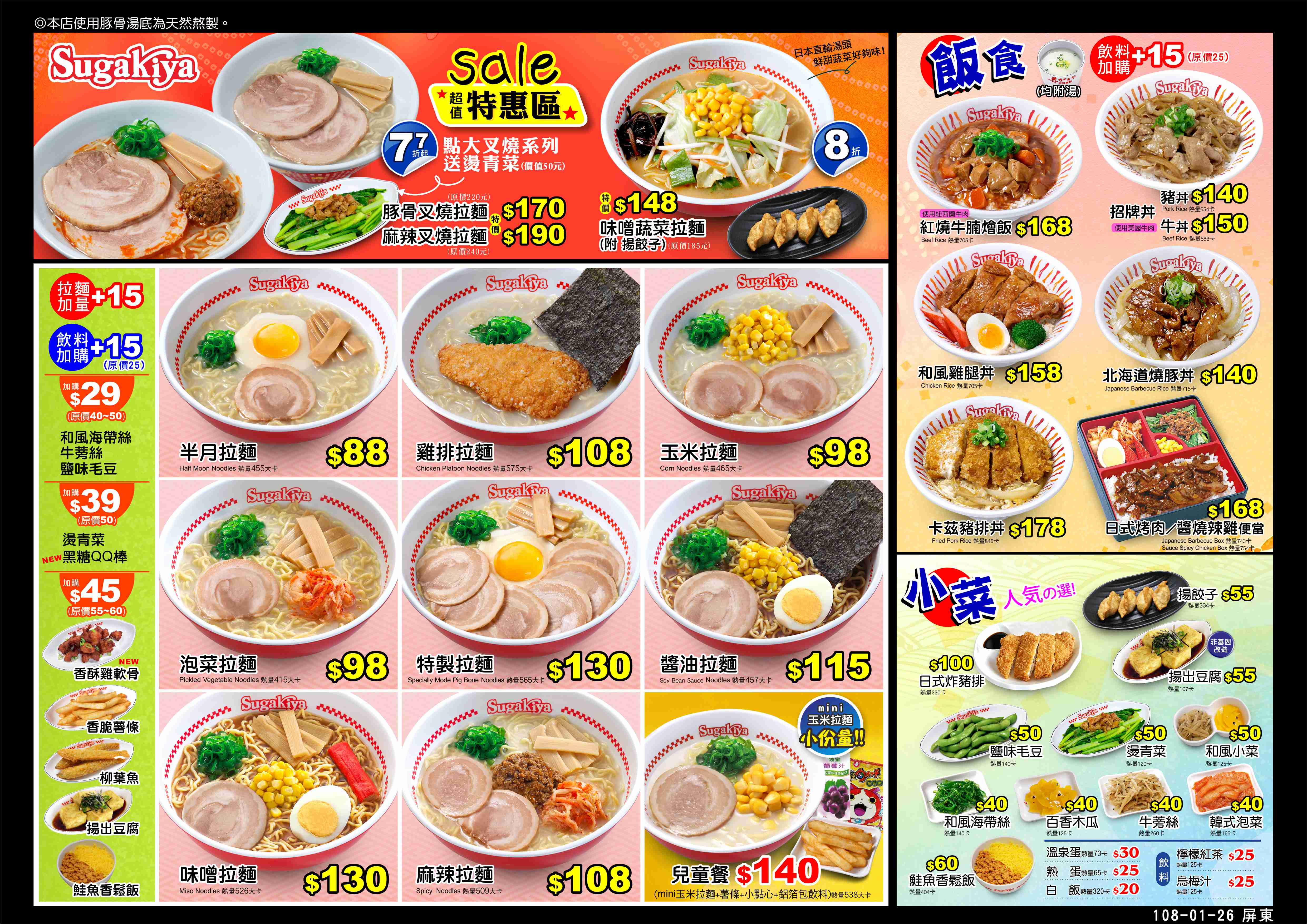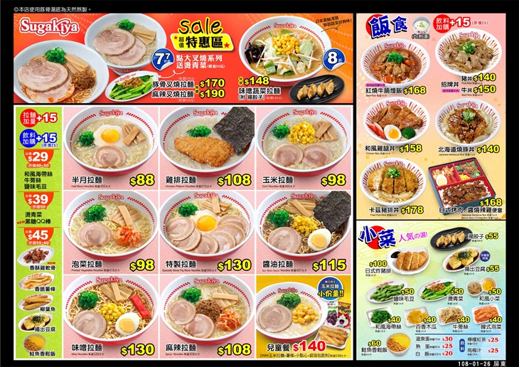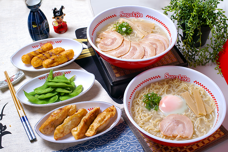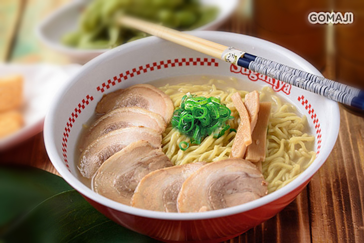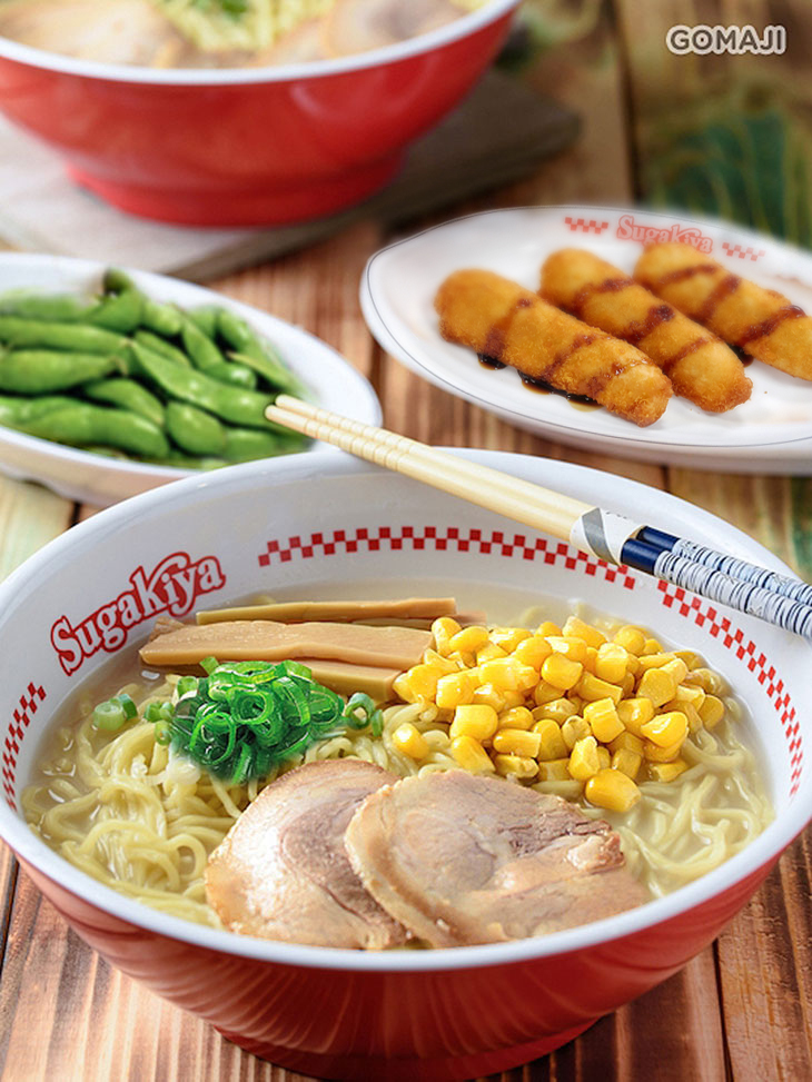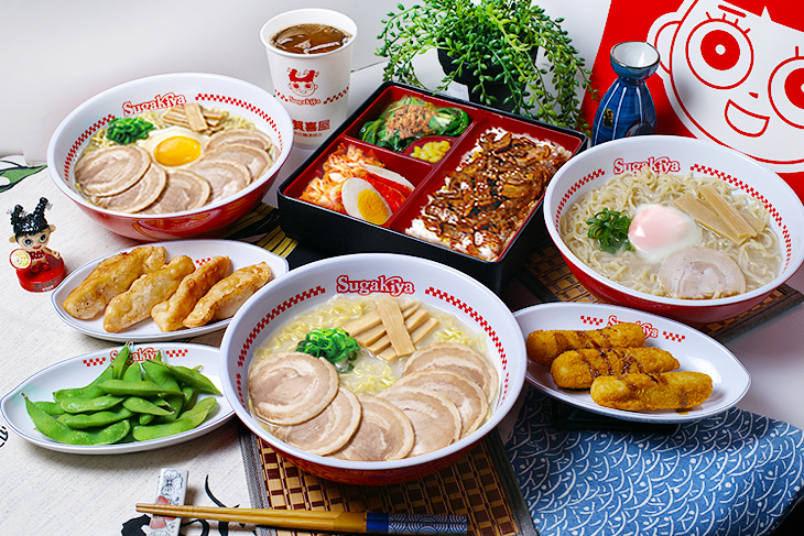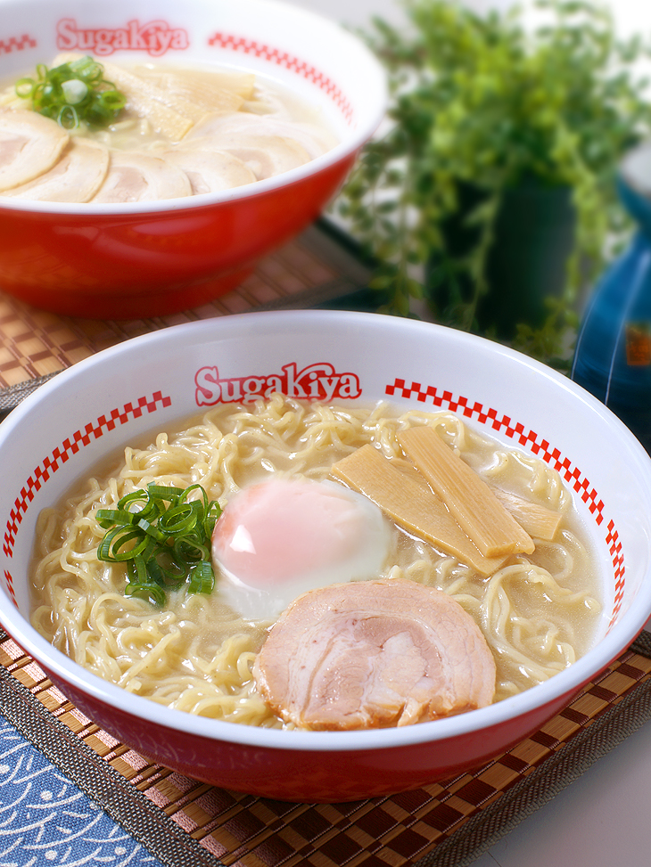 1995年引進台灣的壽賀喜屋日本拉麵連鎖店,來台邁入第24年,提供您最道地的日本名古屋拉麵。壽賀喜屋使用來自日本獨家配方製作的拉麵,由澳洲小麥黃金麵粉經五次壓延而成,麵體泛著淡淡的金黃色,故又稱作黃金拉麵。香Q滑溜的口感,搭配天然豚骨熬製的濃郁白湯,香味撲鼻,道地名古屋拉麵,盡顯於此。