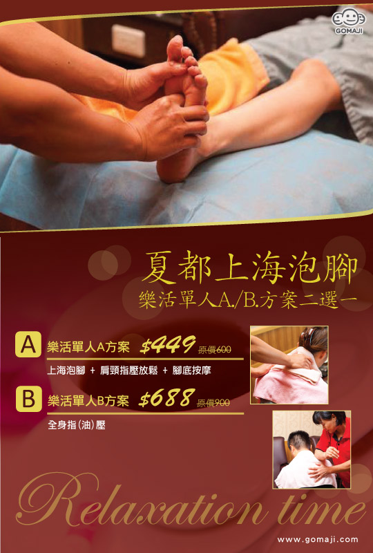 ● 樂活單人A方案:上海泡腳 + 肩頸指壓放鬆20分鐘 + 腳底按摩40分鐘