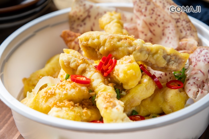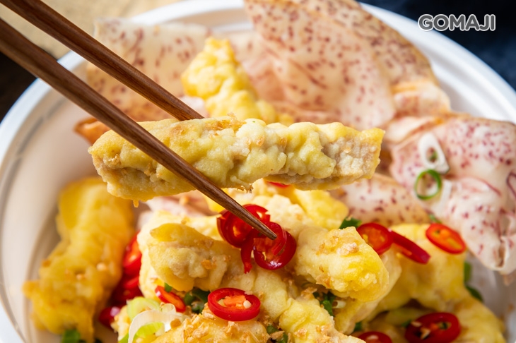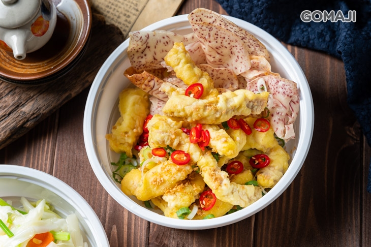 酥炸後的里肌肉,佐以鹹香椒鹽提味,嚐起來脆嫩涮嘴,讓人忍不住一口接一口!搭配一口酥脆的芋頭脆片享用,獨到的風味令人傾心!