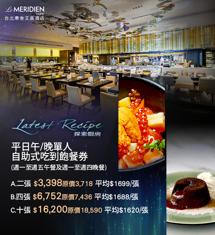 採用開放式自助餐檯與單點兼具的新潮用餐方式,菜樣豐富,從前菜的沙拉,到主食的爐烤比薩、現煎牛排,以及餐後甜點等,都是主廚團隊富滿巧思的創意美味。同時,為了控管食物品質,更隨時更替菜色,僅選用當季最新鮮、肥美的食材料理,看那專業的廚師團隊在您眼前俐落地烹調著每一道餐,令人驚豔的手藝,看得著迷不已!探索廚房,讓品嚐美食成為一種華麗的感官饗宴,開啟自助餐的全新視野!