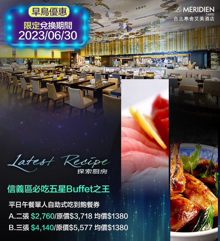 採用開放式自助餐檯與單點兼具的新潮用餐方式,菜樣豐富,從前菜的沙拉,到主食的爐烤比薩、現煎牛排,以及餐後甜點等,都是主廚團隊富滿巧思的創意美味。同時,為了控管食物品質,更隨時更替菜色,僅選用當季最新鮮、肥美的食材料理,看那專業的廚師團隊在您眼前俐落地烹調著每一道餐,令人驚豔的手藝,看得著迷不已!探索廚房,讓品嚐美食成為一種華麗的感官饗宴,開啟自助餐的全新視野!