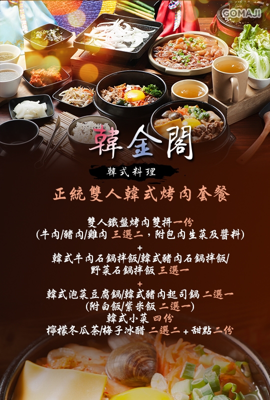 雙人鐵盤烤肉雙拼一份(牛肉/豬肉/雞肉 三選二,附包肉生菜及醬料) + 韓式牛肉石鍋拌飯/韓式豬肉石鍋拌飯/野菜石鍋拌飯 三選一 + 韓式泡菜豆腐鍋/韓式豬肉起司鍋 二選一 (附白飯/紫米飯 二選一) + 韓式小菜 四份 + 檸檬冬瓜茶/梅子冰醋 二選二 + 甜點二份