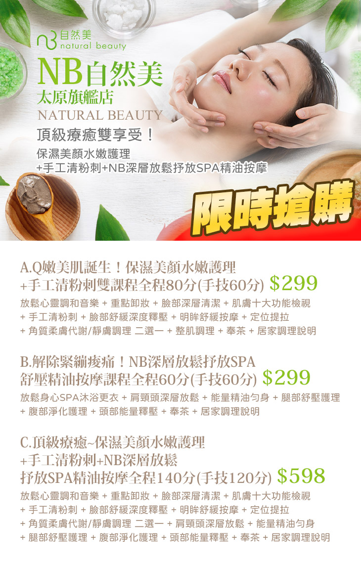 A.Q嫩美肌誕生!保濕美顏水嫩護理+手工清粉刺雙課程全程80分(手技60分) / B.解除緊繃痠痛!NB深層放鬆抒放SPA舒壓精油按摩課程全程60分(手技60分) / C.頂級療癒~保濕美顏水嫩護理+手工清粉刺+NB深層放鬆抒放SPA精油按摩全程140分(手技120分)