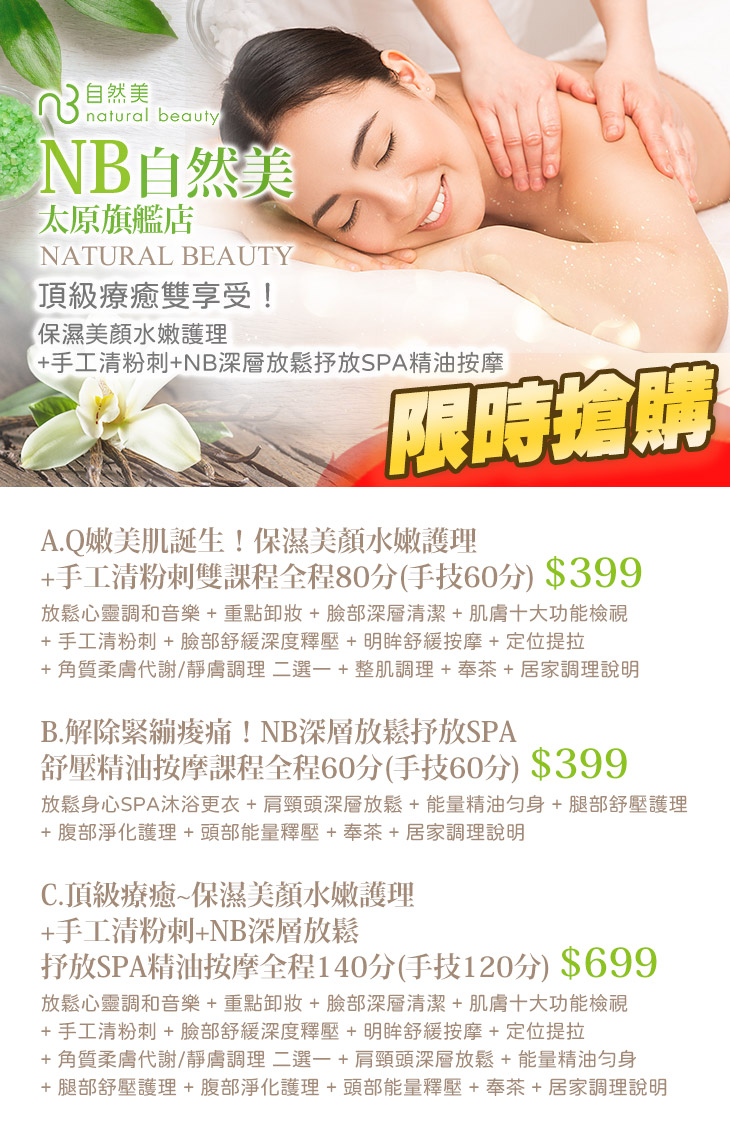 A.Q嫩美肌誕生!保濕美顏水嫩護理+手工清粉刺雙課程全程80分(手技60分) / B.解除緊繃痠痛!NB深層放鬆抒放SPA舒壓精油按摩課程全程60分(手技60分) / C.頂級療癒~保濕美顏水嫩護理+手工清粉刺+NB深層放鬆抒放SPA精油按摩全程140分(手技120分)
