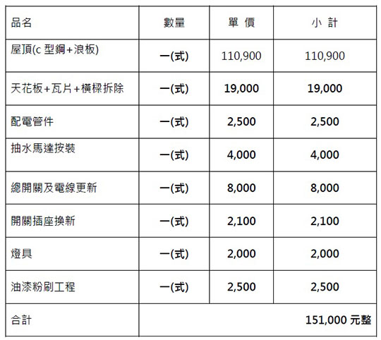本專案募款151,000元,用以進行鐵厝工程和水電工程費用,預計五月開始動工。