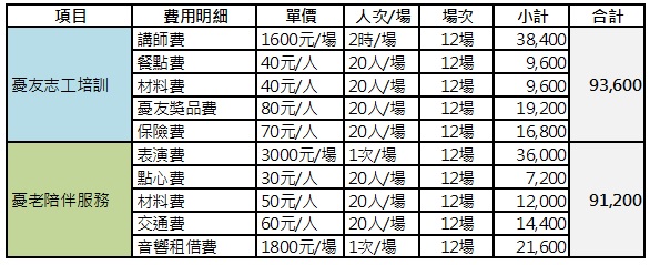 本專案募款184,800元,將服務大台北地區共十二個機構,培訓憂友志工240人次,陪伴機構長者240人次,款項使用期間為2017年10月至2018年9月。