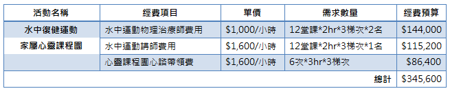 本專案募款345,600元,將使用於身心障礙者的水中復健運動之相關費用,透過多元化的水中運動課程,讓肌肉不會因為缺乏鍛鍊而提早萎縮。另外也將支持身心障礙者之家庭照顧者的心靈課程費用,讓照顧者得到穩定正能量,並讓家屬在壓力下找到出口。