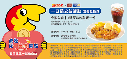 感謝頂呱呱提供響應聯合勸募一日捐的麻吉們,捐款滿500元(含)可獲得乙張頂呱呱「一日捐公益活動餐券」;滿1,000元(含),可獲得兩張頂呱呱「一日捐公益活動餐券」,以此類推;憑券至全台頂呱呱門市即可兌換1號原味炸雞餐乙份,兌換期限即日起至2017年12月31日止(限量贈送,送完為止),使用前請詳閱該餐券之使用規定。