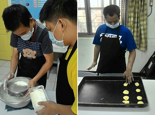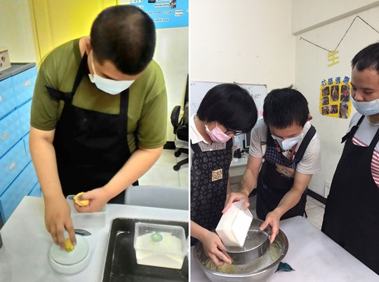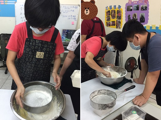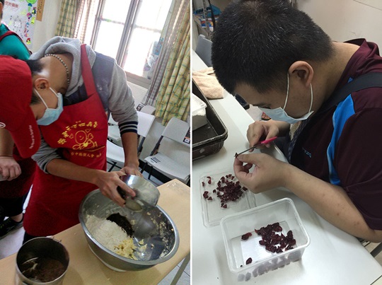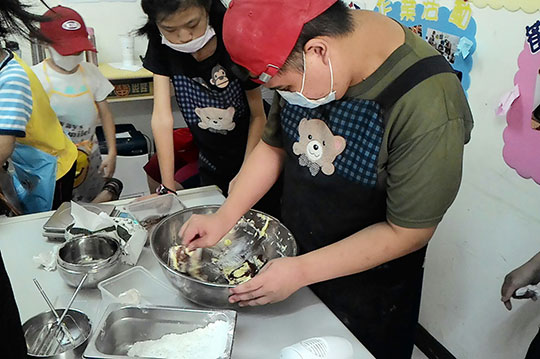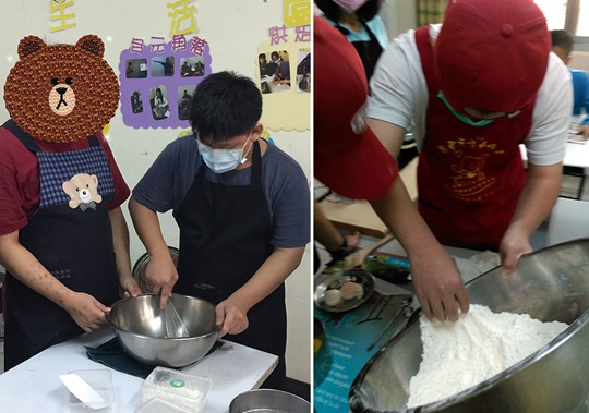 戴上口罩手套、認識與學會使用烘焙器材、秤重、揉麵團、使用烤箱……等等,這些簡單的步驟,一般人也許一、兩次就學會了,但微笑天使總要反覆練習,十次、二十次、甚至更久,才有辦法掌握這些技能。