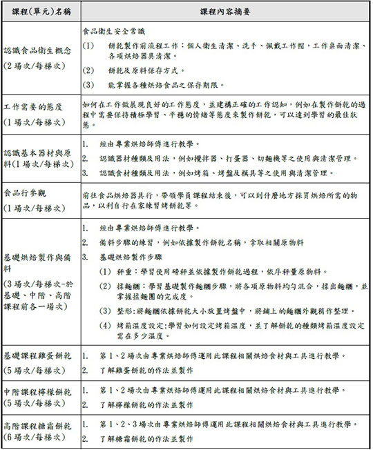 「微笑天使基礎烘焙課程」分為三大部分:學科知識教學、實地參觀與採買食材、烘焙實作,由簡至繁、由易到難,讓學員循序漸進掌握烘焙相關知識與技巧。而最後的餅乾成品,會透過各式販售平台、成果展販賣,並將販售金額交給每位學員,鼓勵其自立行為,進而提升身心障礙者的生活品質。