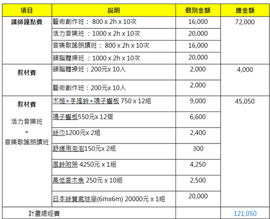 一、音樂歌謠朗讀班:將傳統的民謠經由歌唱及單字,喚起舊時回憶,增進溝通與互動力。