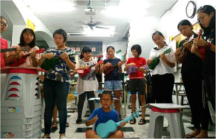 ( 國小學童烏克麗麗班,現在已能外出組曲自彈自唱演出 )