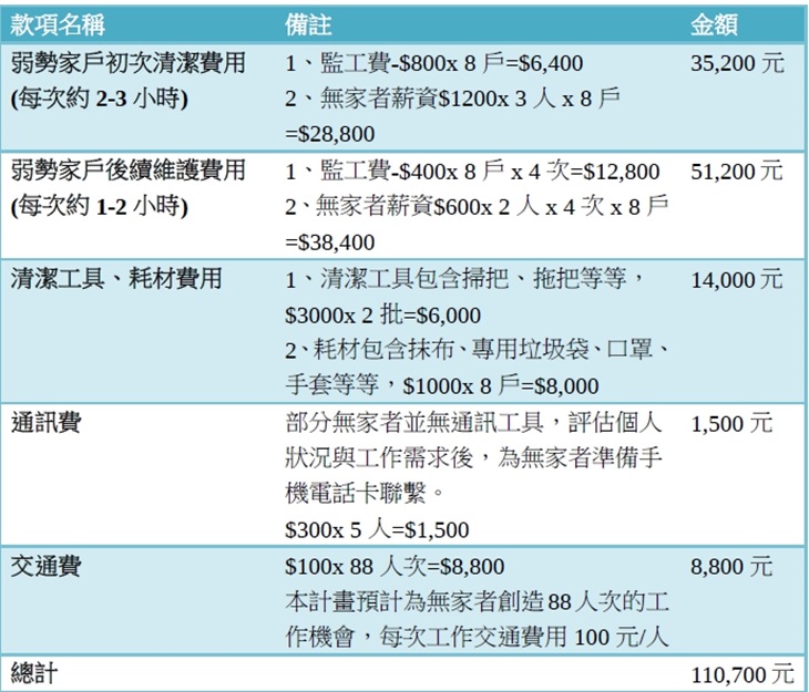 1、監工費用為每次自助助人清潔隊至弱勢邊緣戶家中打掃,會由人生百味一名工作人員陪同費用