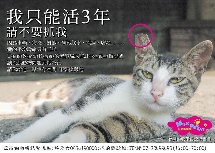 本協會創立於民國95年,本著關懷流浪動物及尊重生命的精神,以認養代替購買、以結紥代替撲殺。 使命為願有生之年能看見台灣的流浪動物不再流浪,把全力放在結紮(TNR trap捕捉、neuter結紮、release放養)、送養、認養、宣導、修法,一步一步來!您撿到貓狗請自己來跟我們一起做吧,目前全力做流浪貓狗TNR,以新北市、桃園市、台北市、基隆市為施行範圍。