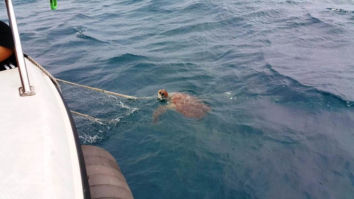 2016年4月5號,接獲通報!發現一隻受困在魚網內,被漁船從外海一路拖行回港口的受傷海龜,我們立即展開即刻救援;「小叮噹」雖然是一隻年輕的綠蠵龜,但是經歷長時間拖行,全身傷痕累累、垂頭喪氣、一點活力都沒有,急救的過程中,小叮噹不斷地吐出在混獲時被強行灌入的魩仔魚,難以想像牠當時有多害怕!