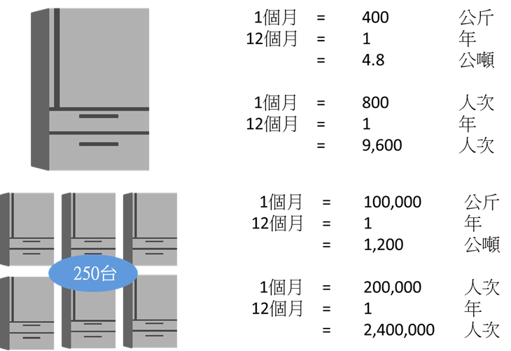 1台愛分享冰箱,1個月可以收取400公斤續食,1年即是處理4.8公噸。250台愛分享冰箱等於處理1200公噸續食,有效減少消費末端的食物浪費,為永續地球盡一份心力。