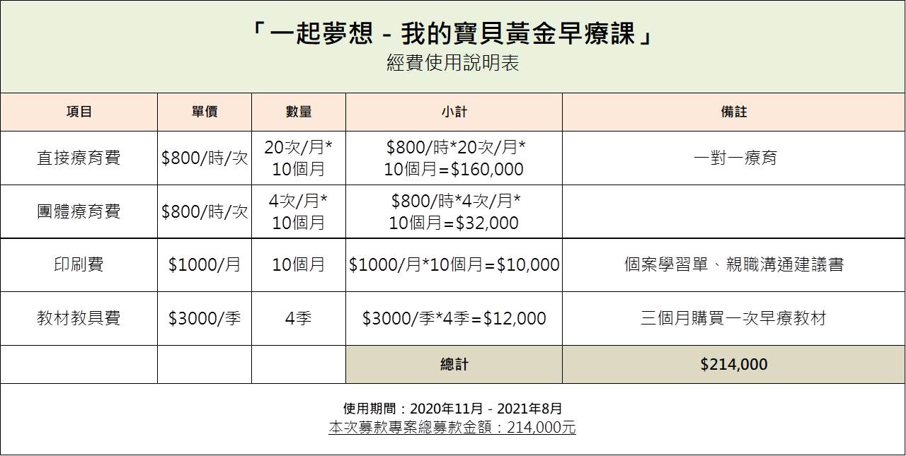 為了幫助更多經濟困難的家庭、急需黃金密集療育的家庭,能夠帶孩子接受黃金階段重要的療育課程,於是協會提出【一起夢想-我的寶貝黃金早療課】計畫,希望能募集大眾愛心,讓沒有經濟能力帶發展較慢的孩子進行早療的弱勢家庭,能夠有免費且密集療育的機會,幫助更多身心障礙幼兒、發展遲緩兒、疑似發展遲緩兒的未來發展!