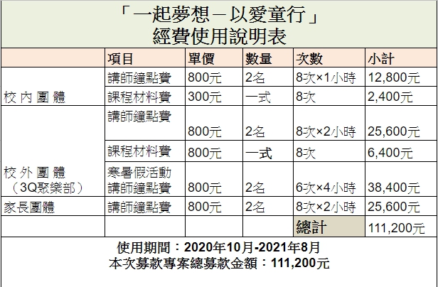 ◎合作單位:本專案由「社團法人中華基督教以琳關懷協會」與「一起夢想」共同推出。