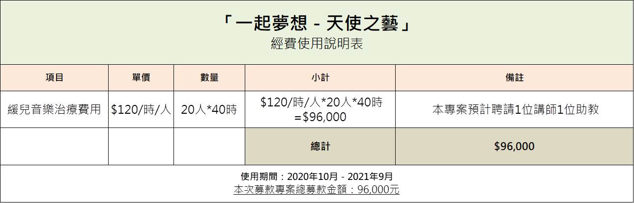 *本協會補助部分講師費標準為$800/時,課程助教費$400/時,本方案預計聘請1位講師1位助教,一小時共補助$1200課程教學費用,不足部分將由協會自籌支應。