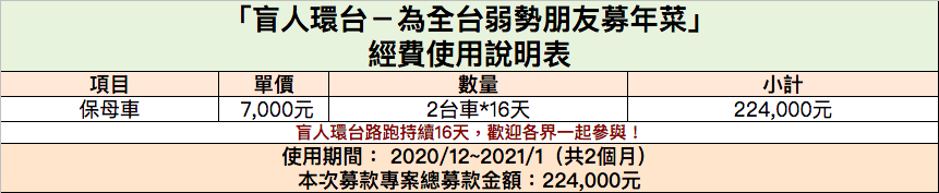 今年盲人環台邁入第四年,考量寒冬將至,為了讓弱勢朋友能過好年,決定在路跑途中替社福單位募集5,000份年菜!受助的六家社福單位分別是:社團法人中華民國自閉總會、財團法人基督教惠明盲人福利會附設台中市私立惠明視障者教養院、社團法人高雄市生命源泉人關懷協會、社團法人宜蘭縣自閉症者福利協進會、財團法人台灣兒童暨家庭扶助基金會、財團法人台東縣私立牧心智能發展中心。