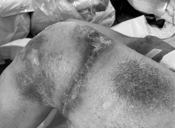 因為雙腳無知覺也無法移動,因此他會在左腳大腿上綁著一圈繩,讓他可以在翻身或是下床的時候借用這條繩子來讓自己的身體移動,可以想到這個辦法也是被生活所逼,然而這也是造成傷口的主要因素。