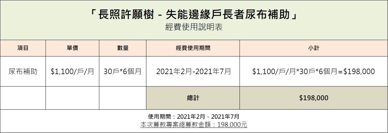 ◎專案摘要:讓30名邊緣戶長者獲得6個月的尿布補助,減少生活負擔!