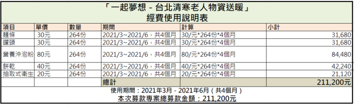 ◎合作單位:本專案由「社團法人中華民國老人福利關懷協會」與「一起夢想」共同推出。