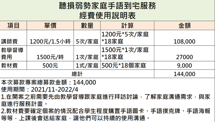 ◎專案摘要:本次專案募集18個聽損家庭的到宅手語服務費用,讓聽損孩童與家庭一起學手語,讓彼此溝通更順暢!