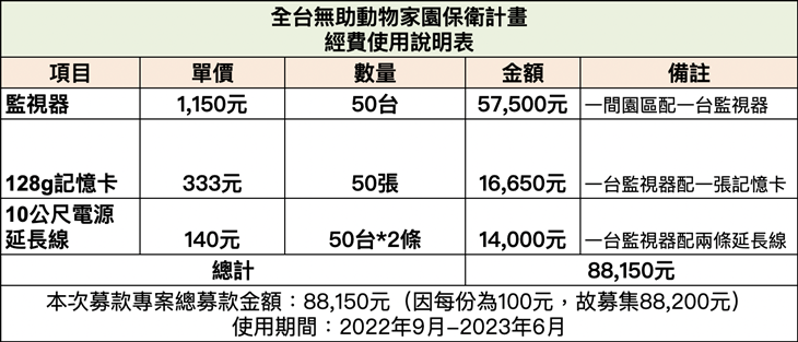 ◎專案摘要:協助全台50間動物收容園區安裝監視器,減少惡意遺棄及投毒等行為,保衛浪浪的家。
