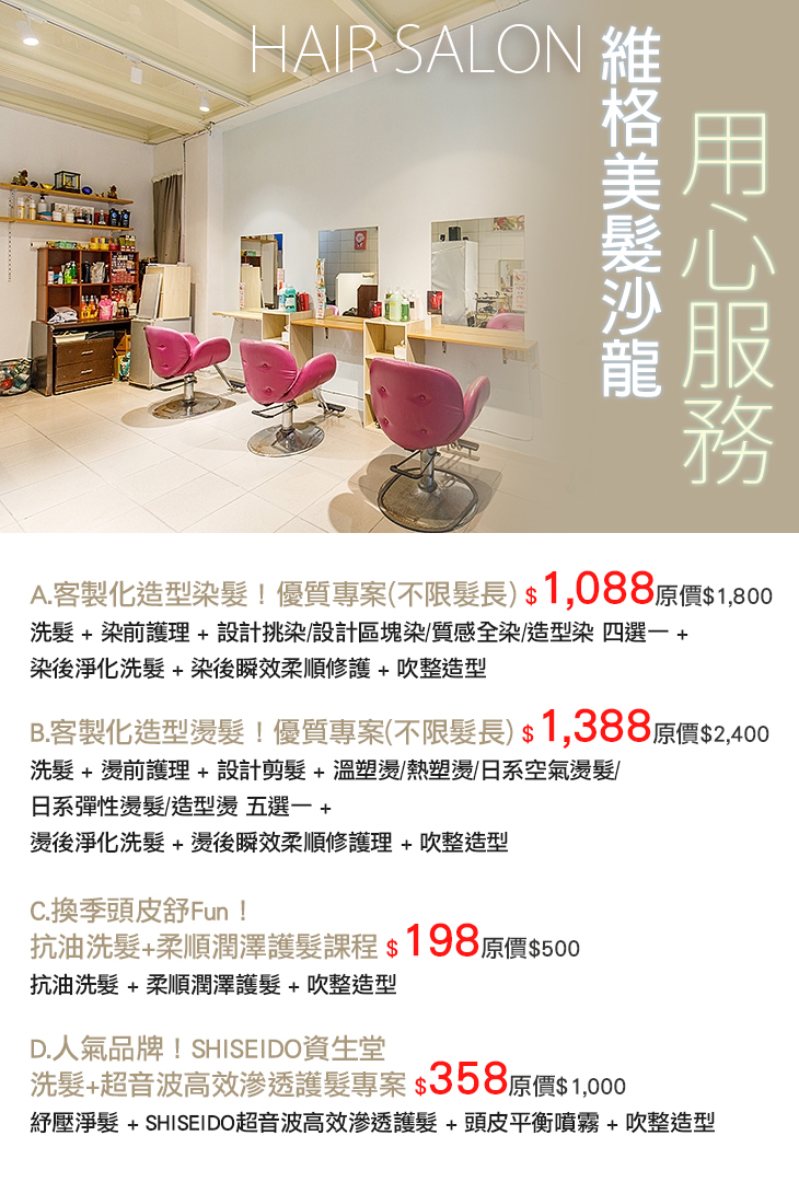 A.客製化造型染髮!優質專案(不限髮長) / B.客製化造型燙髮!優質專案(不限髮長) / C.換季頭皮舒Fun!抗油洗髮+柔順潤澤護髮課程 / D.人氣品牌!SHISEIDO資生堂洗髮+超音波高效滲透護髮專案